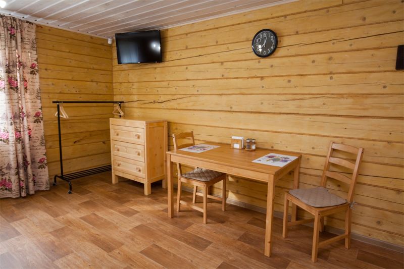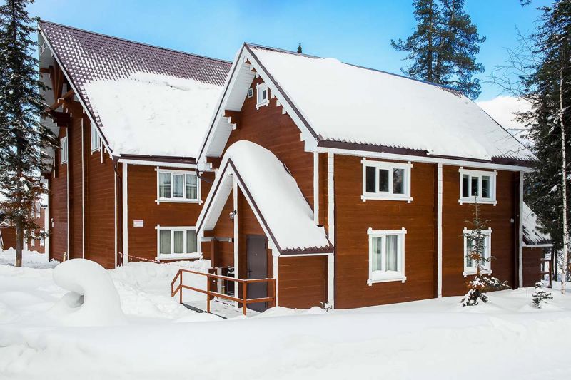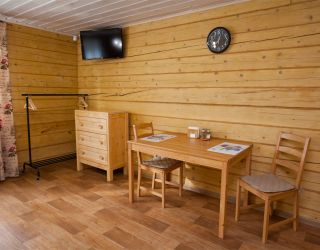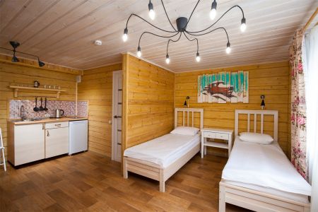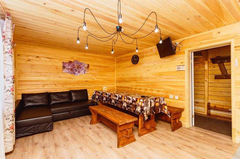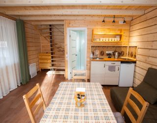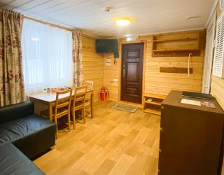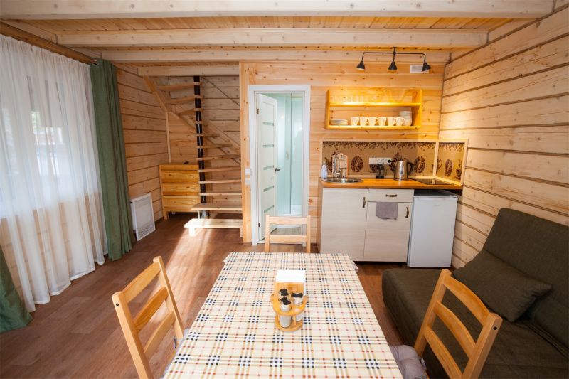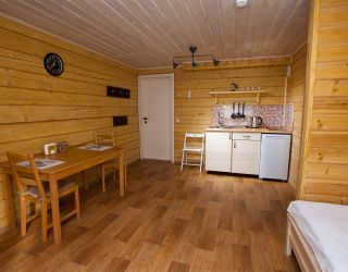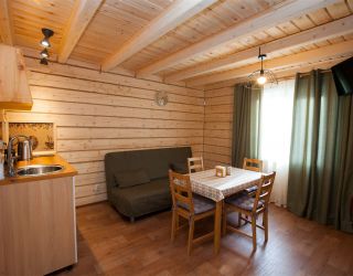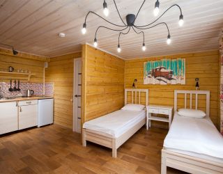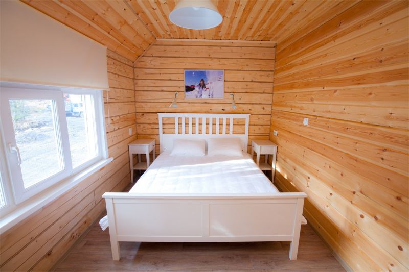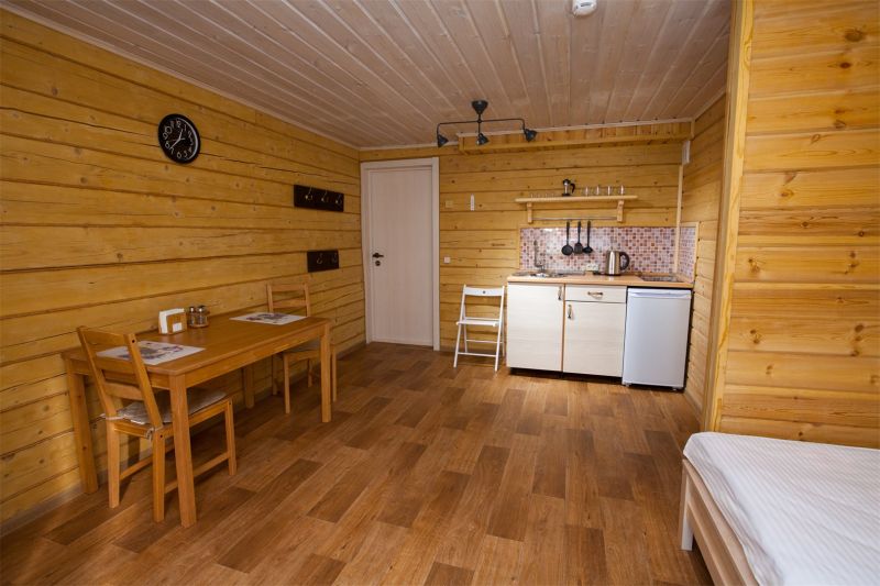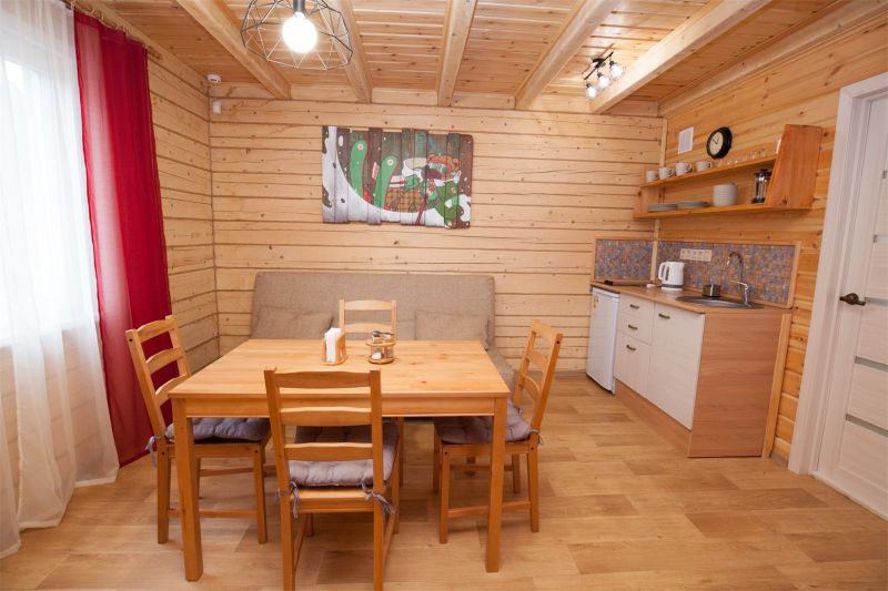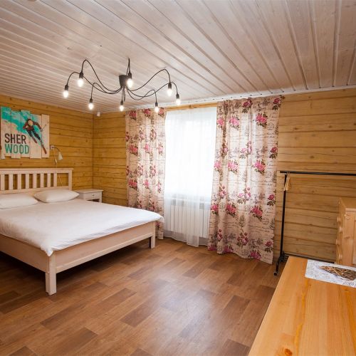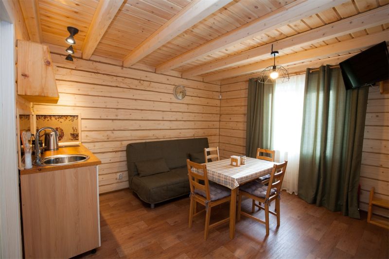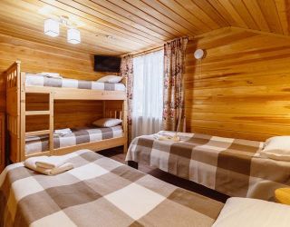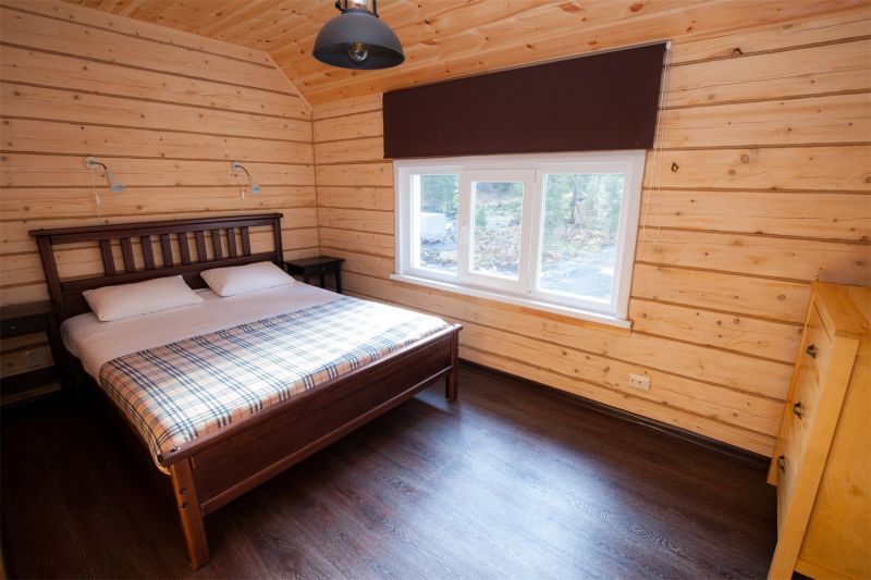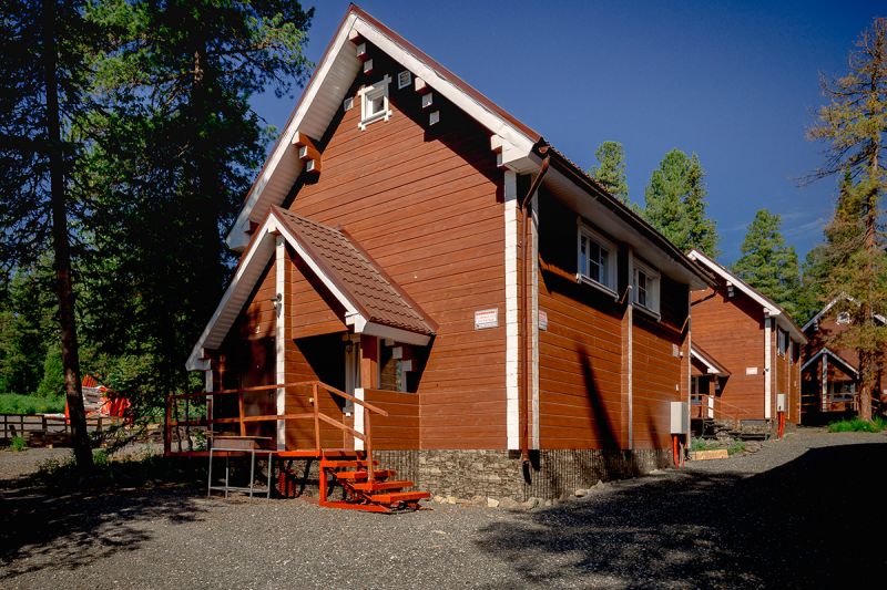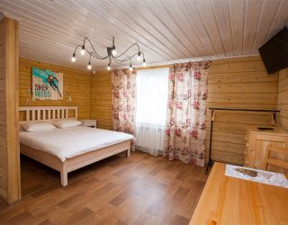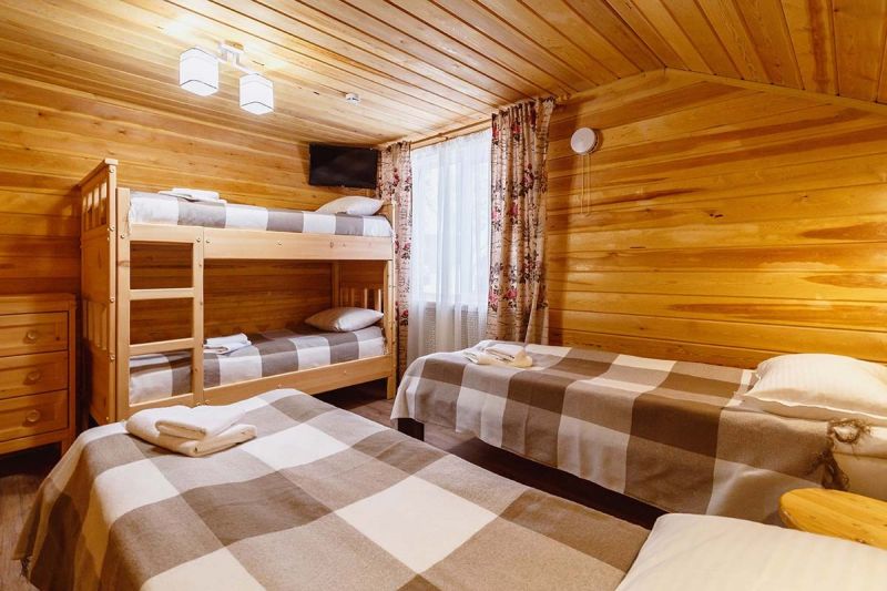 Для проживания предлагается основной корпус с апартаментами трех категорий, 9 шале и гостевой дом на большую компанию - всего 114 мест. Отдых веселых и шумных компаний не помешает семьям с детьми благодаря продуманному расположению корпусов. Интерьер номеров выполнен из натурального дерева, комнаты оборудованы кухней, телевизором, холодильником, санузлом с туалетными принадлежностями и феном. В некоторых категориях шале имеется сауна.