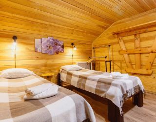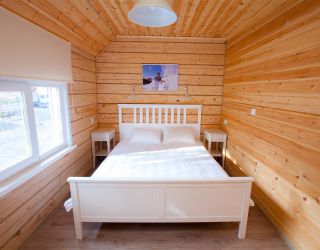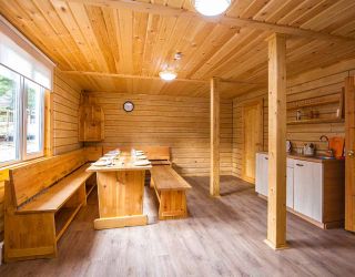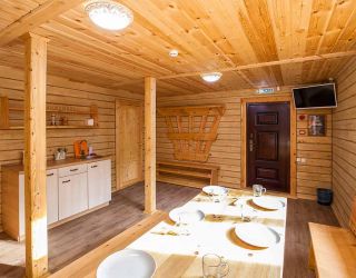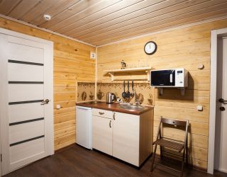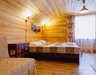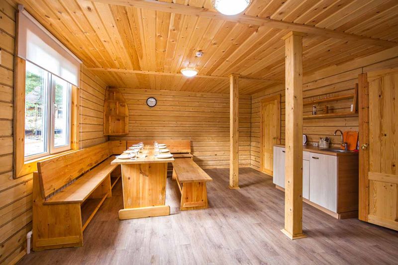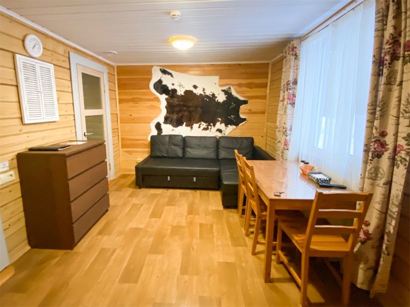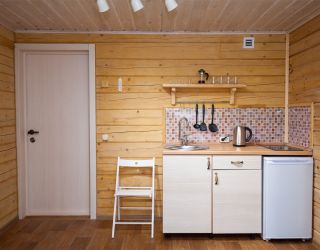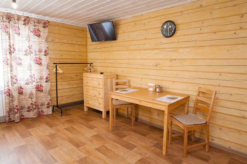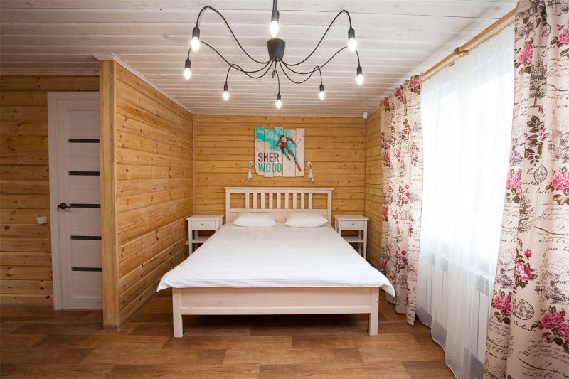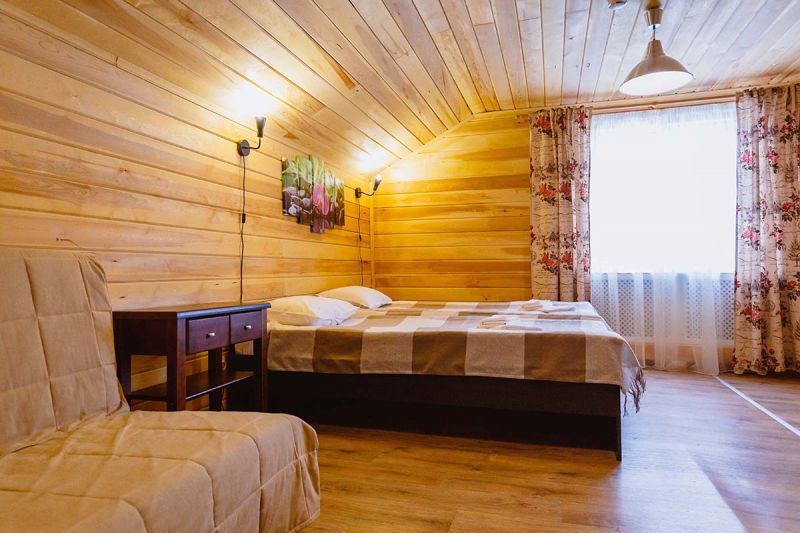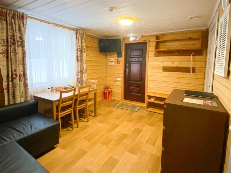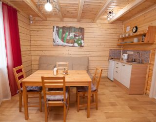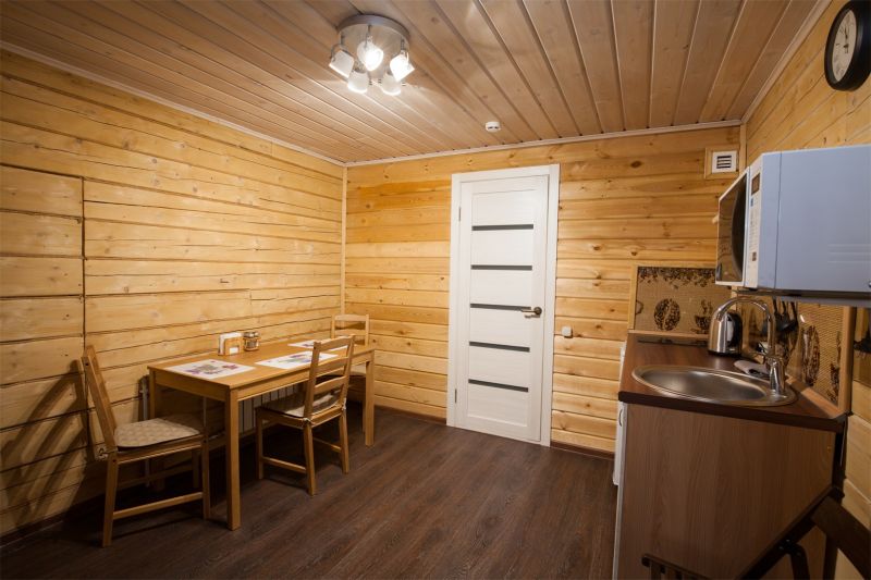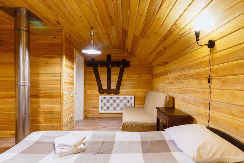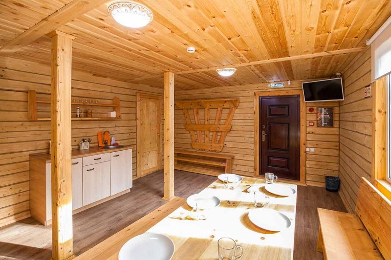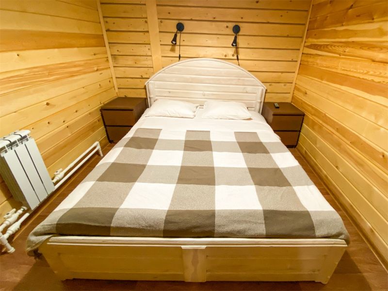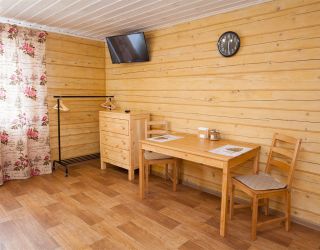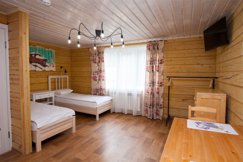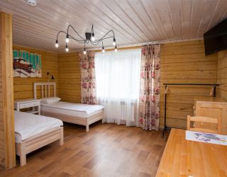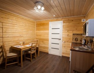 Для проживания предлагается основной корпус с апартаментами трех категорий, 9 шале и гостевой дом на большую компанию - всего 114 мест. Отдых веселых и шумных компаний не помешает семьям с детьми благодаря продуманному расположению корпусов. Интерьер номеров выполнен из натурального дерева, комнаты оборудованы кухней, телевизором, холодильником, санузлом с туалетными принадлежностями и феном. В некоторых категориях шале имеется сауна.